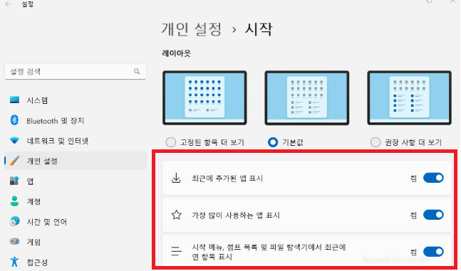 - 최근에 추가된 앱 표시 : 끔