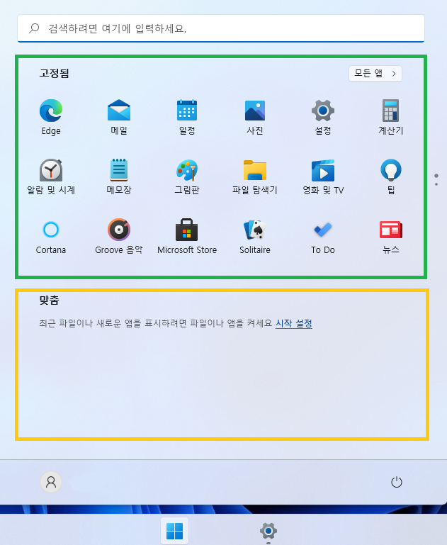 맞춤이 무엇이냐면, 윈도우11에서 시작메뉴를 보면 아래와 같이, 상단 영역과, 하단 영역이 있습니다.