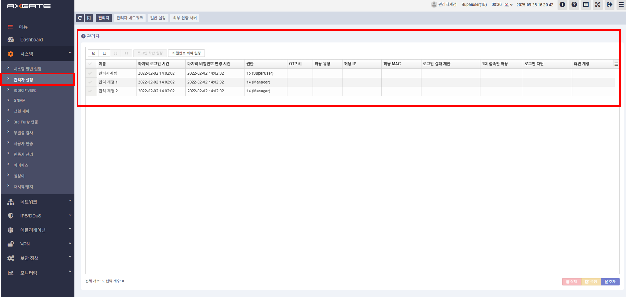이번 포스팅에서는 AXGATE 장비의 관리자 계정 생성 및 권한 설정 방법을 소개합니다.